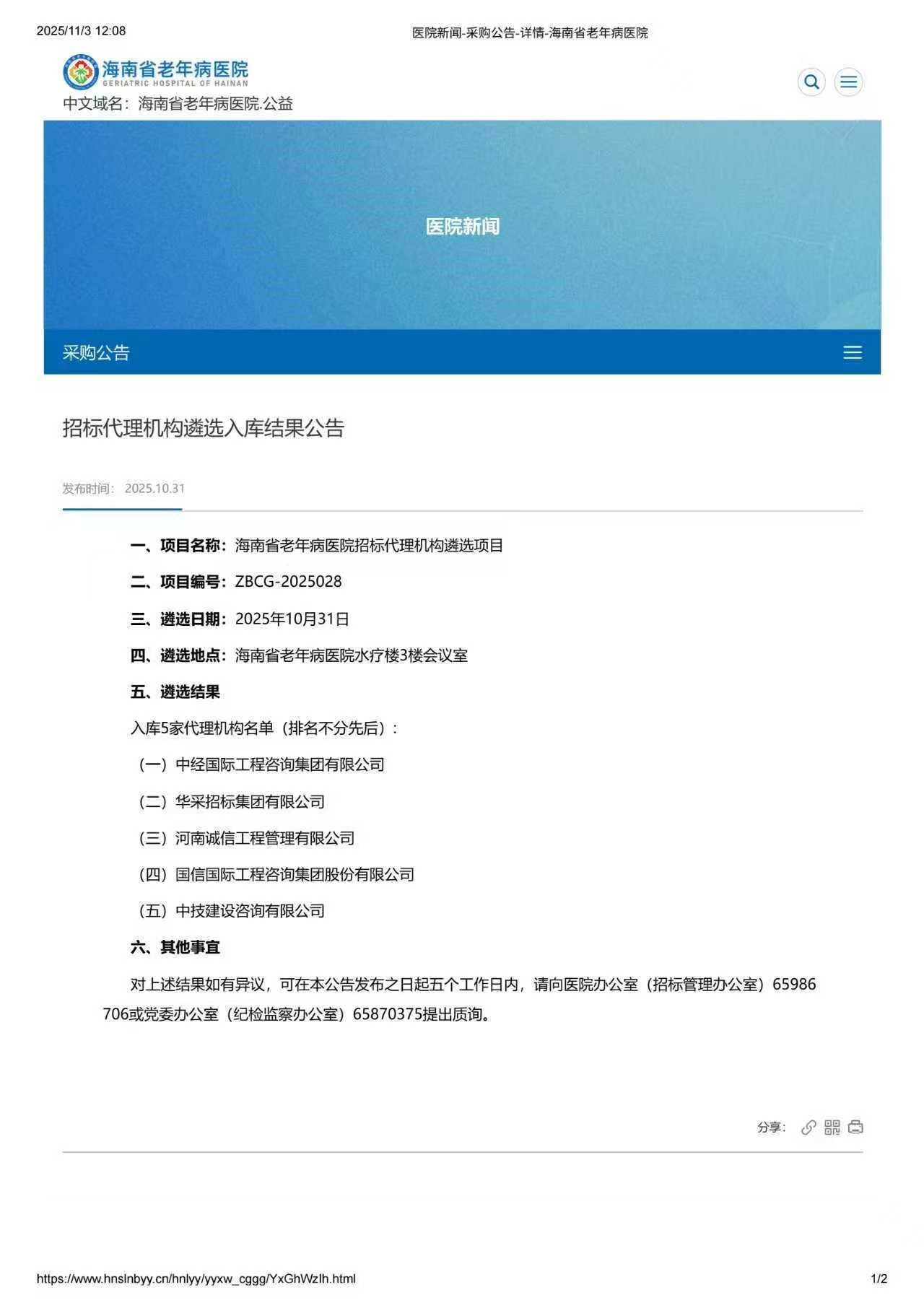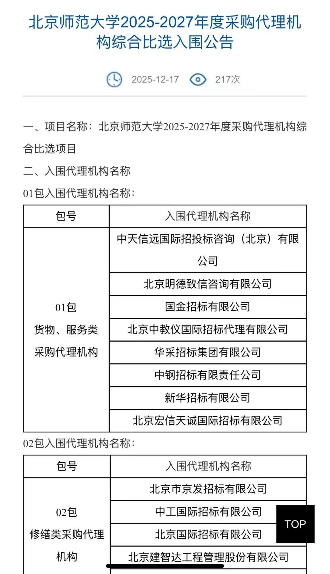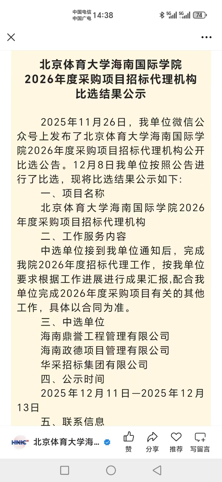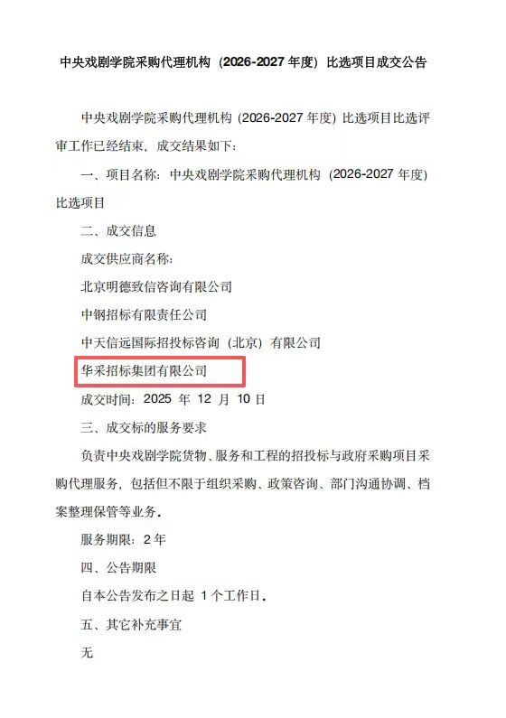 發(fā)布日期:2025-12-22 來源:華采招標(biāo)集團(tuán)有限公司近日,華采招標(biāo)集團(tuán)有限公司憑借專業(yè)實(shí)力與規(guī)范服務(wù),先后成功入圍北京師范大學(xué)、中央戲劇學(xué)院、北京體育大學(xué)海南國際學(xué)院、瓊臺(tái)師范學(xué)院等四家高校,以及北京市西城區(qū)展覽路街道、海南省第三人民醫(yī)院、海南省老年病醫(yī)院三家政企醫(yī)療單位的招標(biāo)代理機(jī)構(gòu)庫,實(shí)現(xiàn)多領(lǐng)域業(yè)務(wù)拓展新突破。